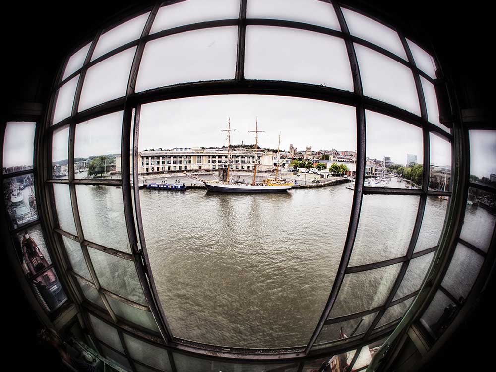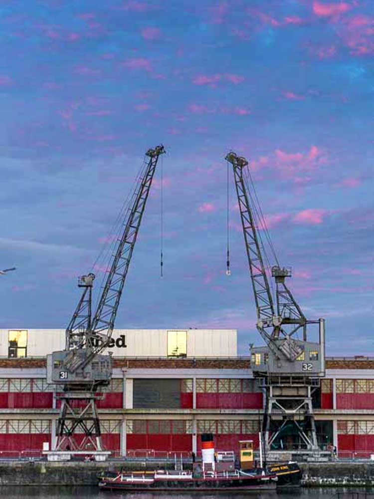 Here;’s a cracking photo of the iconic dockside cranes taken on a twilight photo course late last year. Recently I had the opportunity as part of a commission to take the opposite view from inside the crane on the left of the first photo.  Using a fish-eye lens gave this wacky perspective.